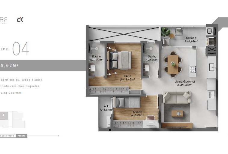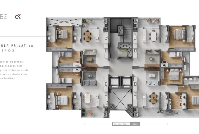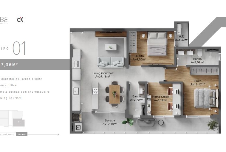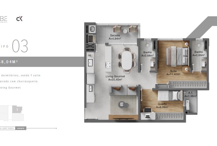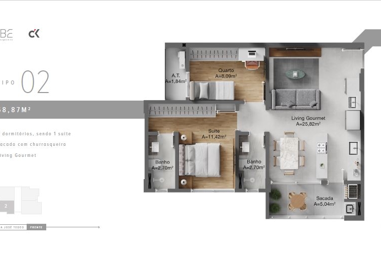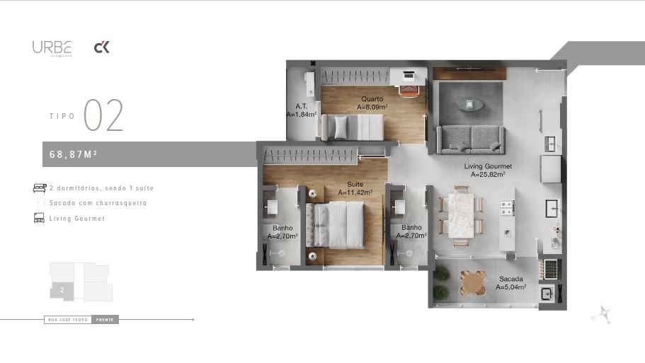 Os apartamentos são de 2 ou 3 quartos, sendo 1 suíte, com 1 ou 2 vagas de garagem e tem 4 opções de plantas, com 68 ou 87 m² privativos. Com living integrado à cozinha, com conceito aberto, sacada com churrasqueira e piso porcelanato nas áreas sociais do imóvel.